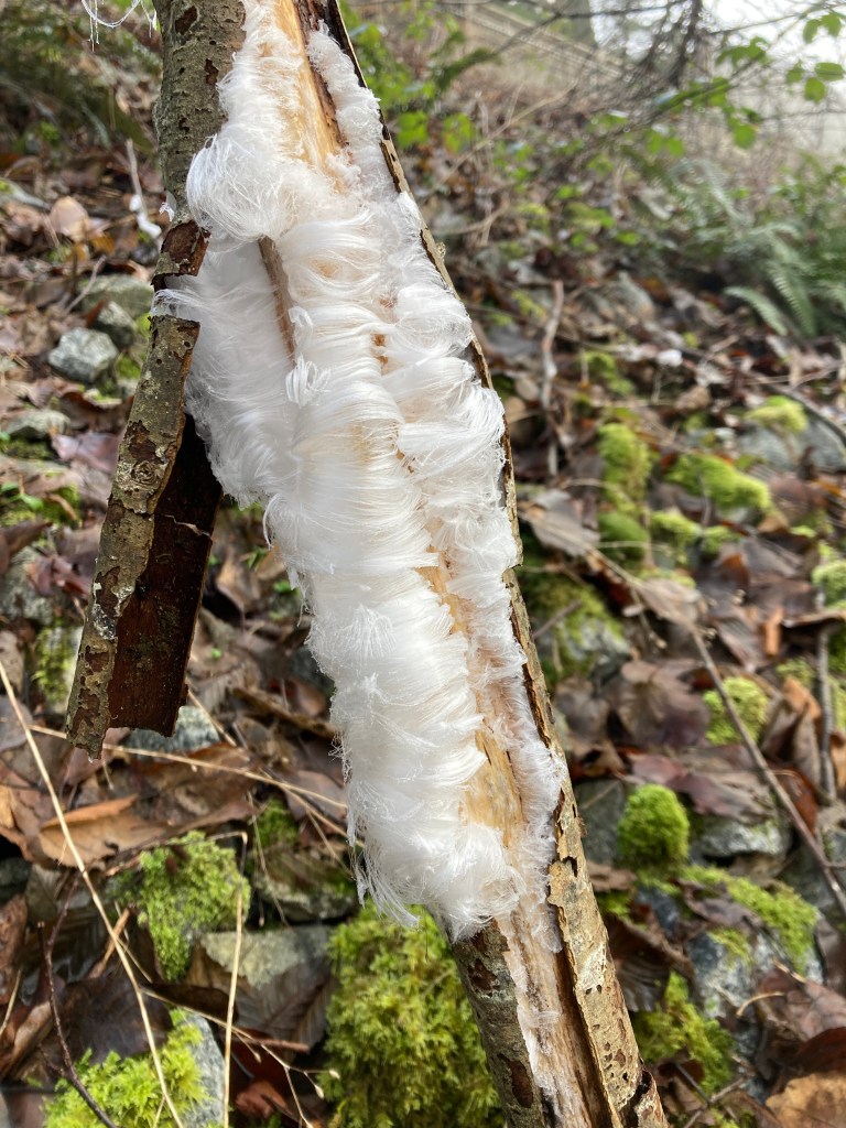 So, what is it? This strange phenomenon, this Hair Ice, sometimes called Frost Beard or Ice Wool only occurs under certain conditions. So it’s kind of rare! In order for ice to form on the bark of apparently rotting or dead trees there has to be a fungus present within the wood called Exidiopsis Effusa. With the right humidity, and this particular fungus that prevents water from forming large ice crystals, silky looking hair-like stands emerge causing branches to grow a coat of fur. 😊 Amazing!